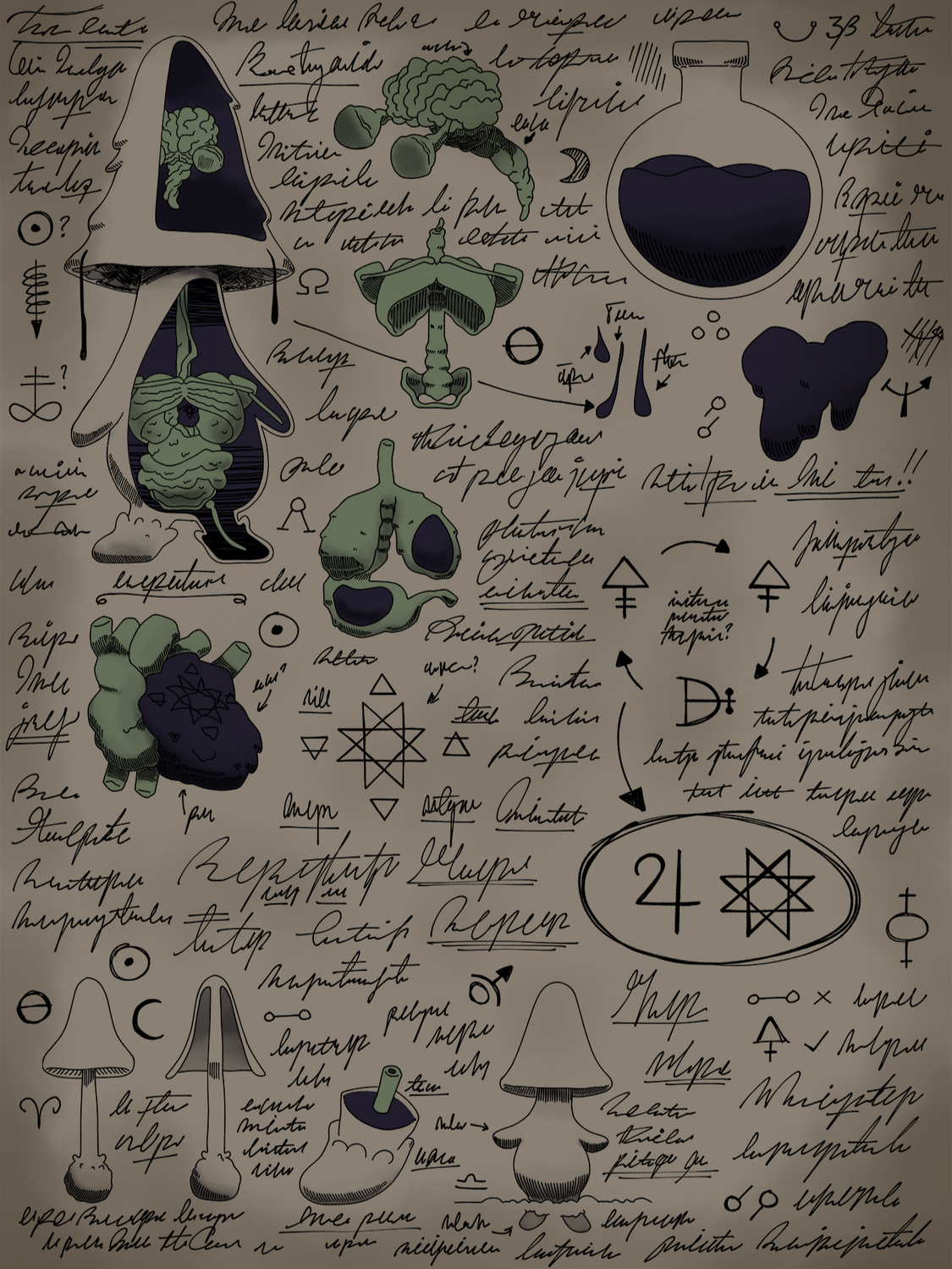 May 21st, 1656The local brewer visited me this day claiming a persistent ill-feeling; including such symptoms as periodic bouts of aggression and a pervasive cold that wracked his body. Upon closer examination I discovered the patient was, indeed, suffering from an overheating of the blood. I can only postulate that this would certainly have manifested from an overabundance of the yellow bile in his system, which would be congruent with the man’s increased body temperature as the over-concentration would unbalance the system and warm the blood in an uneven manner. I went into my stores to retrieve a tincture that would aid in the expulsion of this choleric disposition imbalance, but alas my recent work has kept me too long from the forests and I have not had the time to gather the necessary ingredients to replenish my stocks after the calamitous illnesses of the townsfolk experienced during the previous melancholic season. My endeavors to find a suitable apprentice or assistant have thus far been in vain. I shall be forced to redouble my efforts lest my obligations to the residents of this village detract further from my research.Previously, I have documented a flourishing growth of aconitum napellus (Future Crane’s note: Monkshood) to serve as a tincture base to aid in the expulsion of yellow bile along the nearby stream (no not the one with the frogs that glare so wickedly at me, I do believe that is the stream to the west). As I have recently taken to having several fainting spells in my lab, it seemed wise to revitalize my body with the elements and abate my own melancholy. I packed a meal (addendum: the attempt to preserve bread using the magnesium salts concocted this past winter did not go as planned) (second addendum: it does make for a very efficient toast however) to accompany me along with the lovingly illuminated transcription of The Tragical History of the Life and Death of Doctor Faustus by the one Ch. Marl. received as payment from that one traveling merchant last season in exchange for several tinctures of rendered essence from my garden of atropa belladonna (Future Crane’s note: Deadly Nightshade).It was a trivial matter to locate the embankment of Monkshood so I allowed myself some brief respite. I fear, despite my attempts to balance my own humors, the black bile still has an outsized influence upon the makeup of my own sanguine nature. Given my attempts to abate the black bile with intense heat in my lab I thought it wise to re-establish a point of equilibrium in the refuge of the forest’s boughs before attempting another round of self-experimentation.As I had set about reading from the volume of Dr. Faustus (as it turns out, most disappointingly, the literature lacks any basis in modern alchemic theory and the necromancy described therein was not even an interrogation of throwing wide the last door that separates man from god, power over death itself. Instead, I was entreated to a religious prattling of ethics. I shall leave such topics for the scholars and the coffee house intellectuals to debate. Unfortunately, a complete waste of belladonna extract. Not even one theory about the animation of so much as a finger.) As I was musing on the foolishness of the author’s writing, I noticed a strange stain has suddenly appeared on a page of the book. In looking for the source I came to realize my finger was coated in a glistening midnight black ichor. I was immediately beset by panic that the imbalance of my humors had grown so severe from the expedition out of my lab that it had begun to manifest through my very skin. After much prodding, no more of this substance could be entreated to be expelled or make its origin known. It was only after my mind calmed that I was able to see that I had sat down next to a small clump of mushrooms. They were the most peculiar specimens I’ve ever seen. Thick black ink droplets formed around the rim of the cap and formed a stream of some size composed of this glistening ichor. From the rivulets of onyx in the ground, I saw miniaturized forms of the dripping mushrooms already beginning to burgeon. I had to learn the origin of this mysterious liquid and already new ideas have begun to churn and cascade at the implications of what I’ve seen.(Future Crane’s note: It seems here is where I closed the book I was writing in at the time. I have a terrible habit of writing in whichever journal is closest at hand when the inspiration strikes. This means my writings are a myriad of disconnected entries in each book with no regards to such ideas as linearity or organization. I shall continue to sort through my grimoires for where I penned the next entry, which I believe detailed my experiments with this newly found substance, and how it set about a chain of events that brought me here today.)
